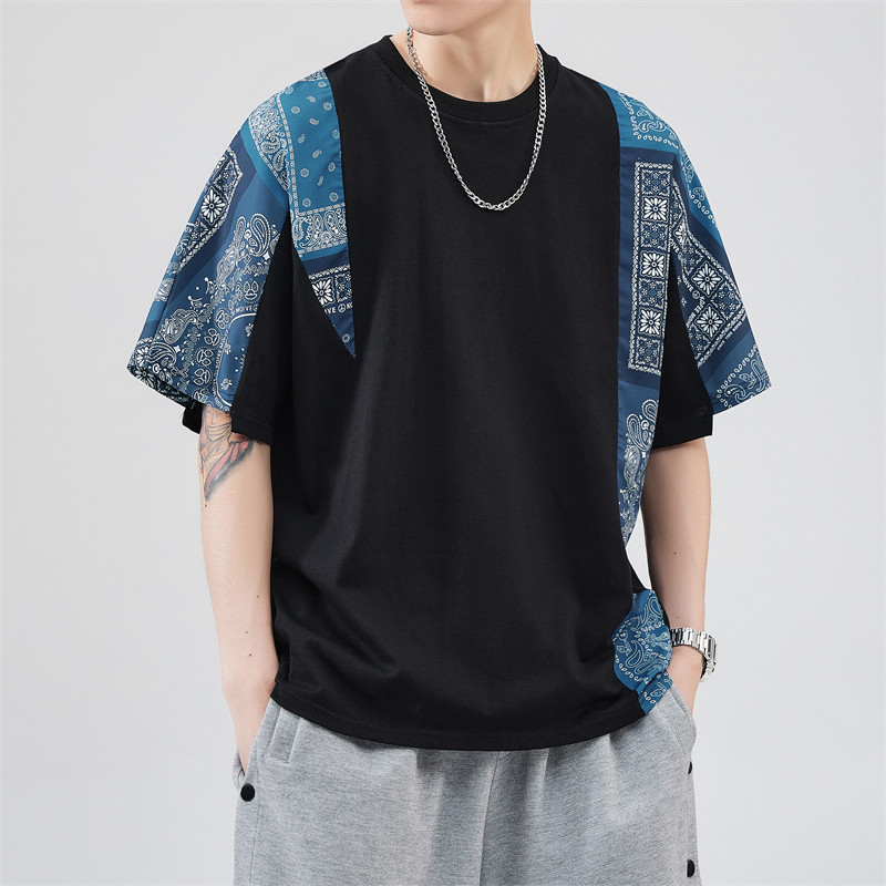 网红拼接腰果花五分袖T恤男女简约新款夏季ins潮流圆领体恤打底衫