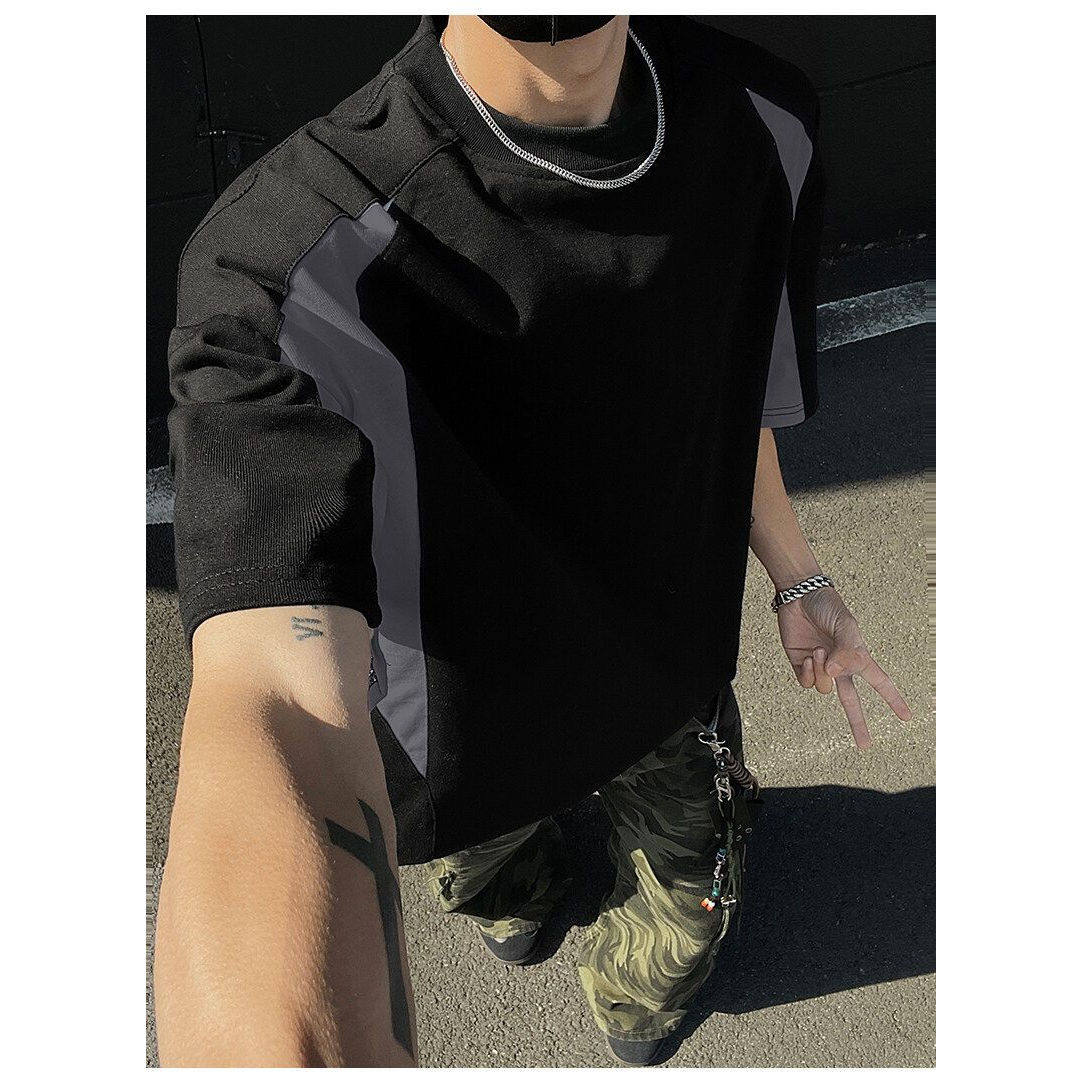 GENANX闪电潮牌夏季新款250g重磅T恤黑白条纹拼色五分袖T恤男