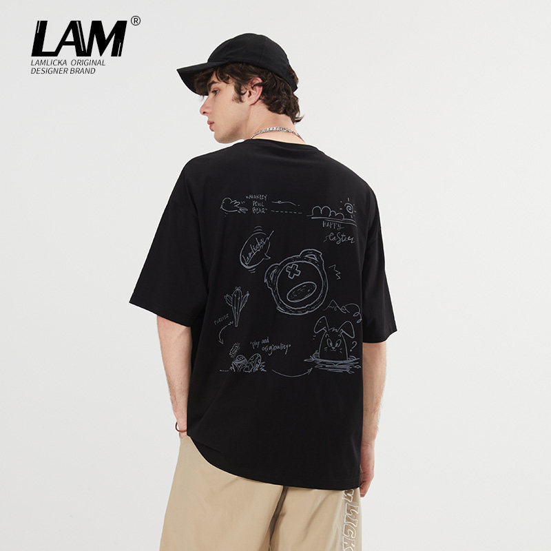 LAMLICKA国潮手绘印花五分袖t恤男潮牌休闲学生情侣黑色上衣宽松