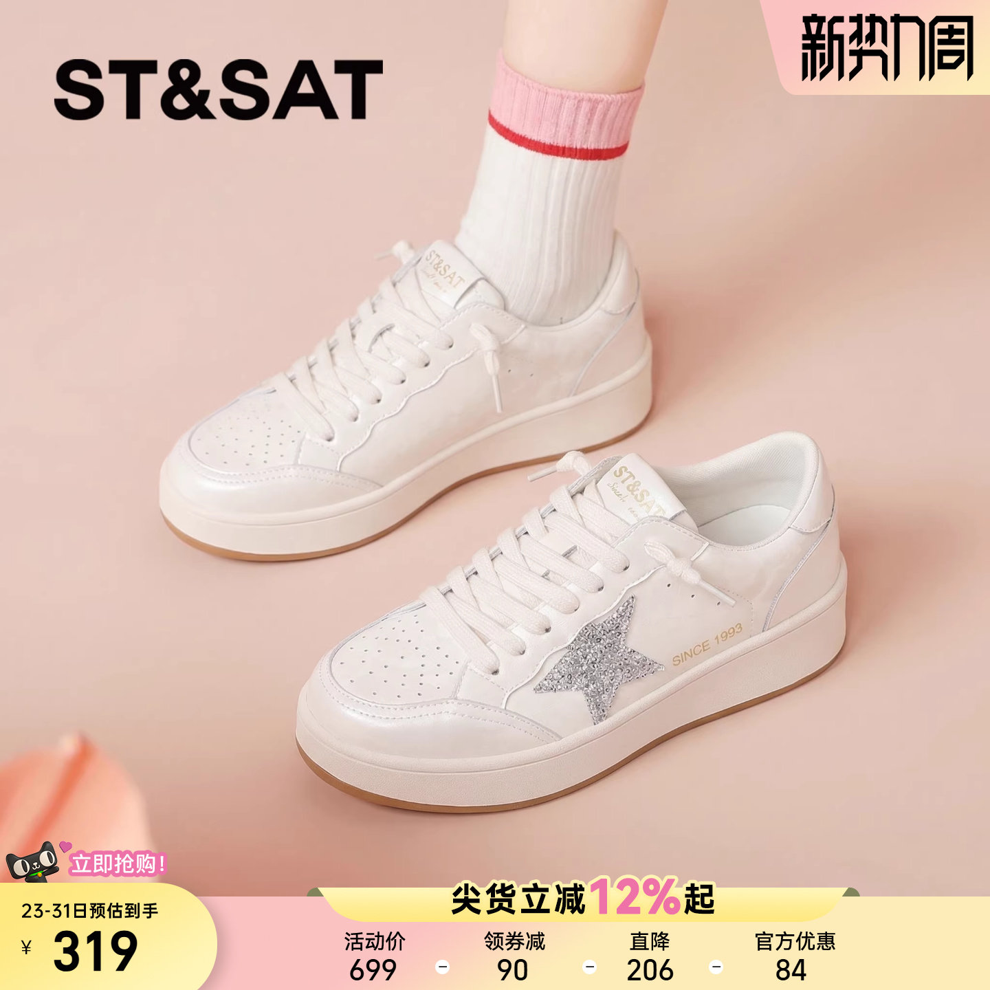 星期六简约小白鞋女2026新款春季星星亮钻皮面时尚百搭休闲板鞋爆