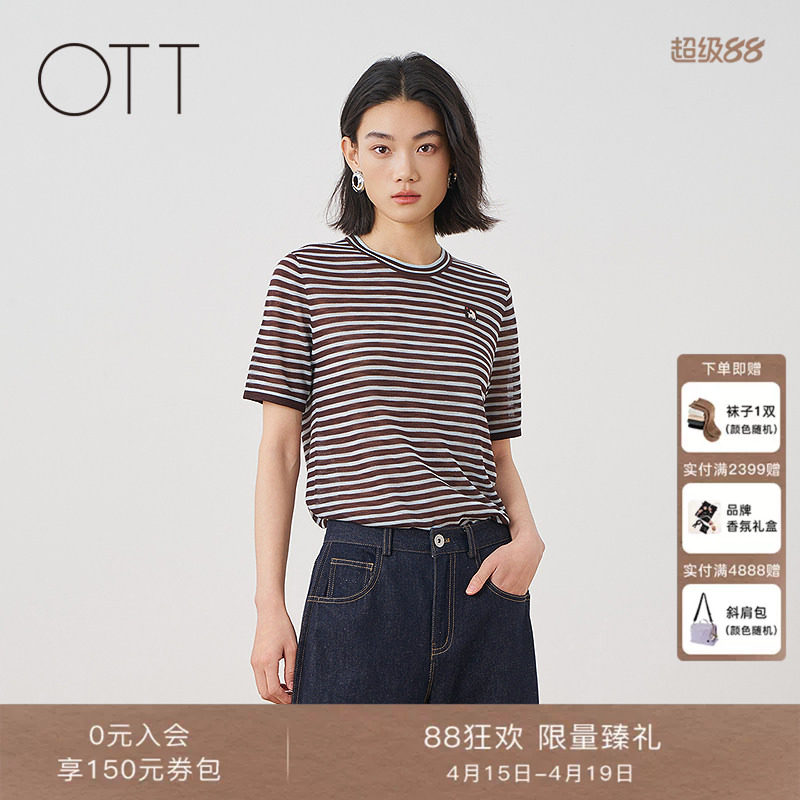 OTT2026夏季新款条纹短袖针织T恤女圆领休闲百搭上衣毛织套头衫