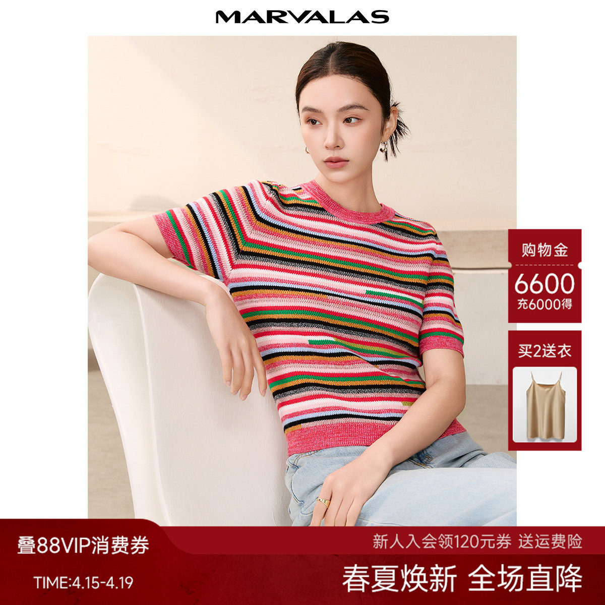 曼德诗短袖针织衫2026春季新款圆领彩虹条纹T恤时尚撞色套头衫女