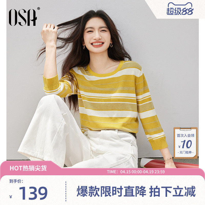 【春日明媚条纹衫】OSA欧莎减龄七分袖套头衫女春季新款黄色上衣