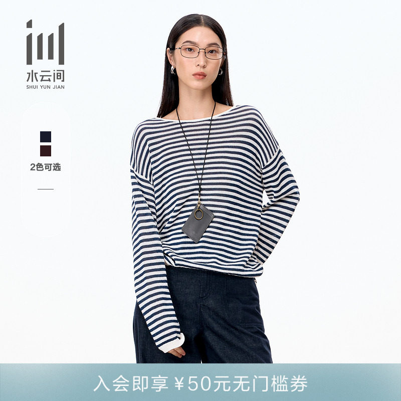 水云间女装 圆领套头宽松条纹休闲长袖T恤针织衫2025秋季新款