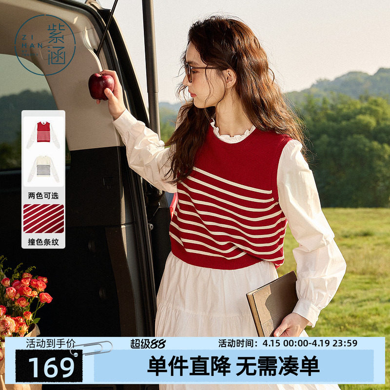 紫涵假两件撞色条纹针织马甲女春秋季新款甜美木耳领套头针织衫潮