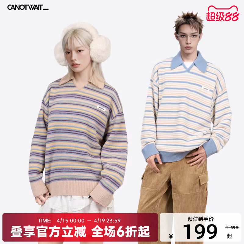陈伟霆CANOTWAIT_拼色条纹POLO领套头毛衣慵懒针织衫秋冬男女新品