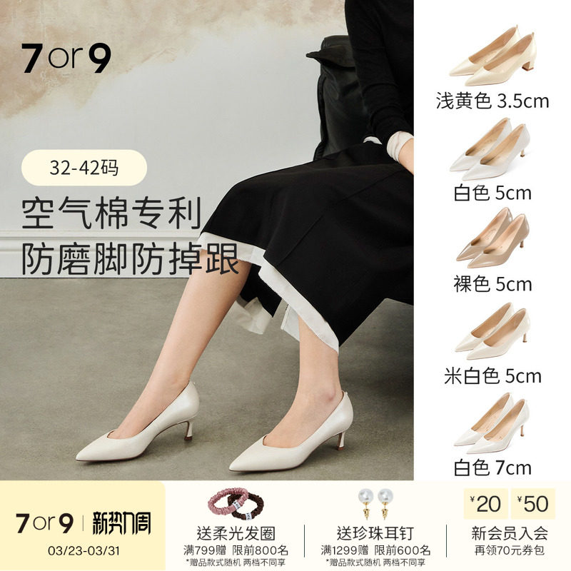 明星同款7or9春夏女鞋裸色白色尖头羊皮通勤职业细高跟鞋单鞋茉莉