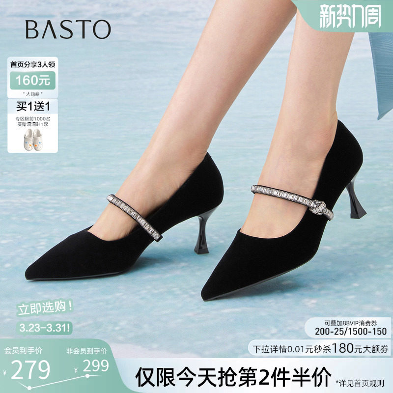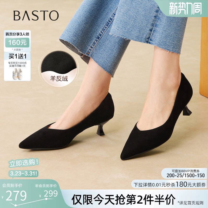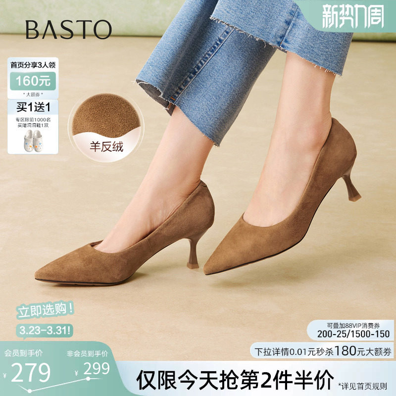 百思图2026春季新款羊皮绒面细跟高跟鞋尖头女浅口单鞋K5811AQ6