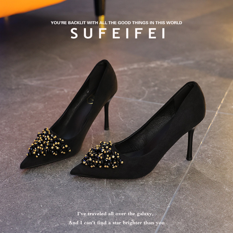 苏妃妃2026新款水钻黑色不累脚高跟鞋女细跟尖头气质高级职业单鞋