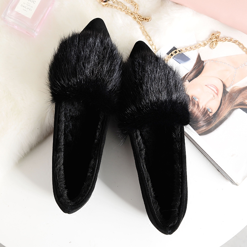 真皮水貂毛毛鞋豆豆鞋女冬秋季2024新款加绒单鞋尖头平底毛毛瓢鞋
