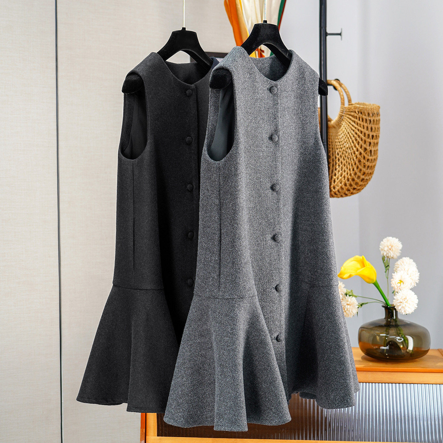 C家2025年秋冬新款女装极简风宽松显瘦无袖纯绵羊毛背心A字连衣裙