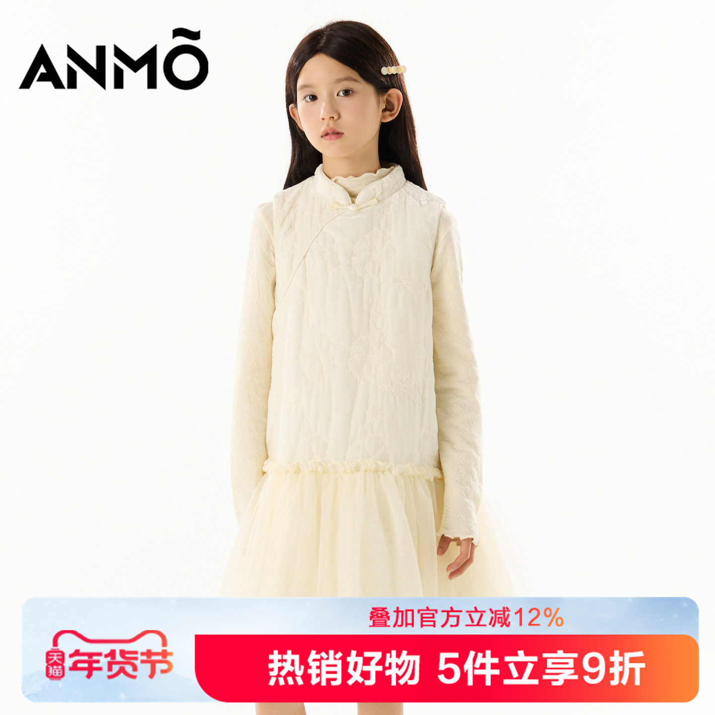ANMO安墨女童无袖连衣裙秋冬新品提花拼接蕾丝中大童裙装甜美气质