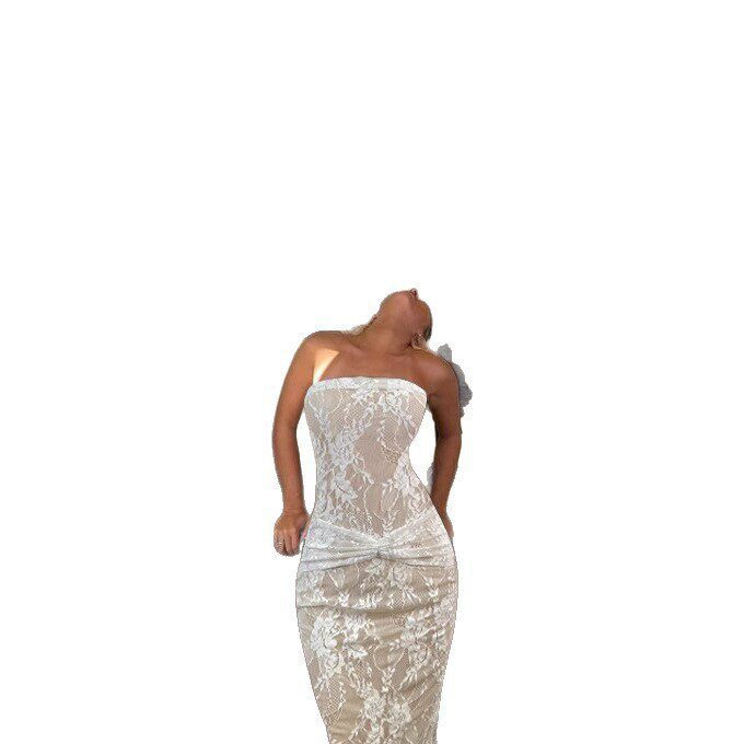 Ahagaga 性感蕾丝单层透视包臀连衣裙欧美辣妹一字肩抹胸露背长裙