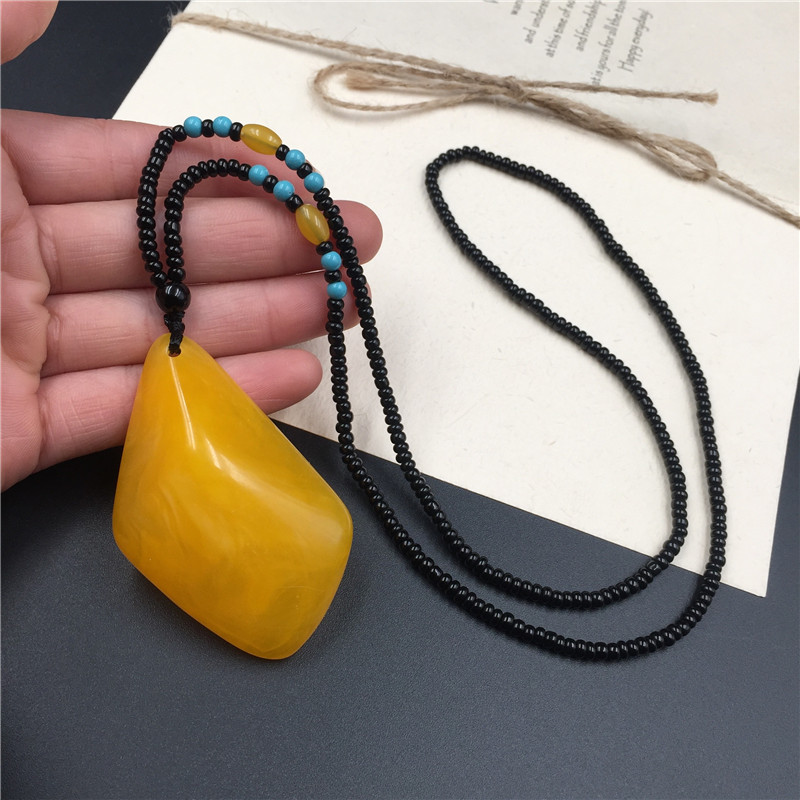 热销纯手工米珠绳树脂仿蜜蜡项链百搭款 钱袋菱形水滴吊坠毛衣链