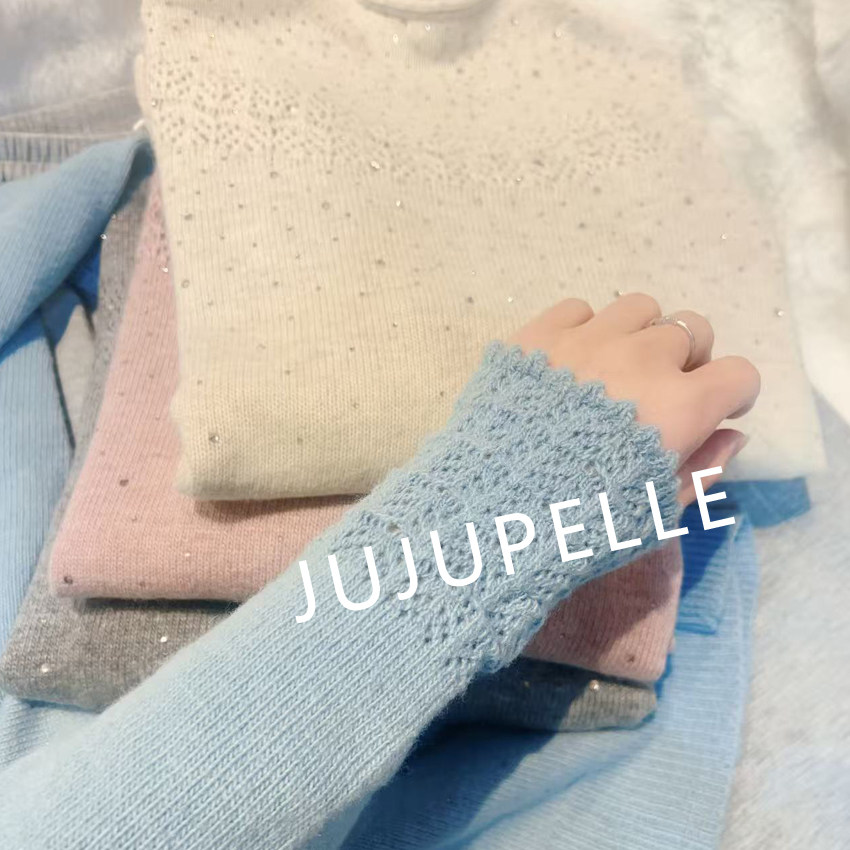 蜜熊绒+绵羊毛~钩花纯色烫钻半高领2025冬季针织衫打底衫女款毛衣