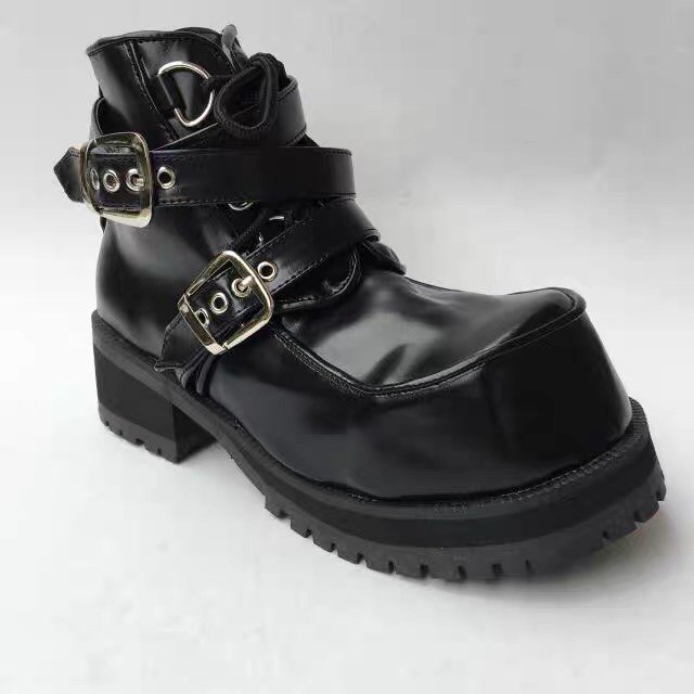2021新款粗跟朋克短靴皮带扣装饰情侣鞋大头鞋日系原宿风个性演出