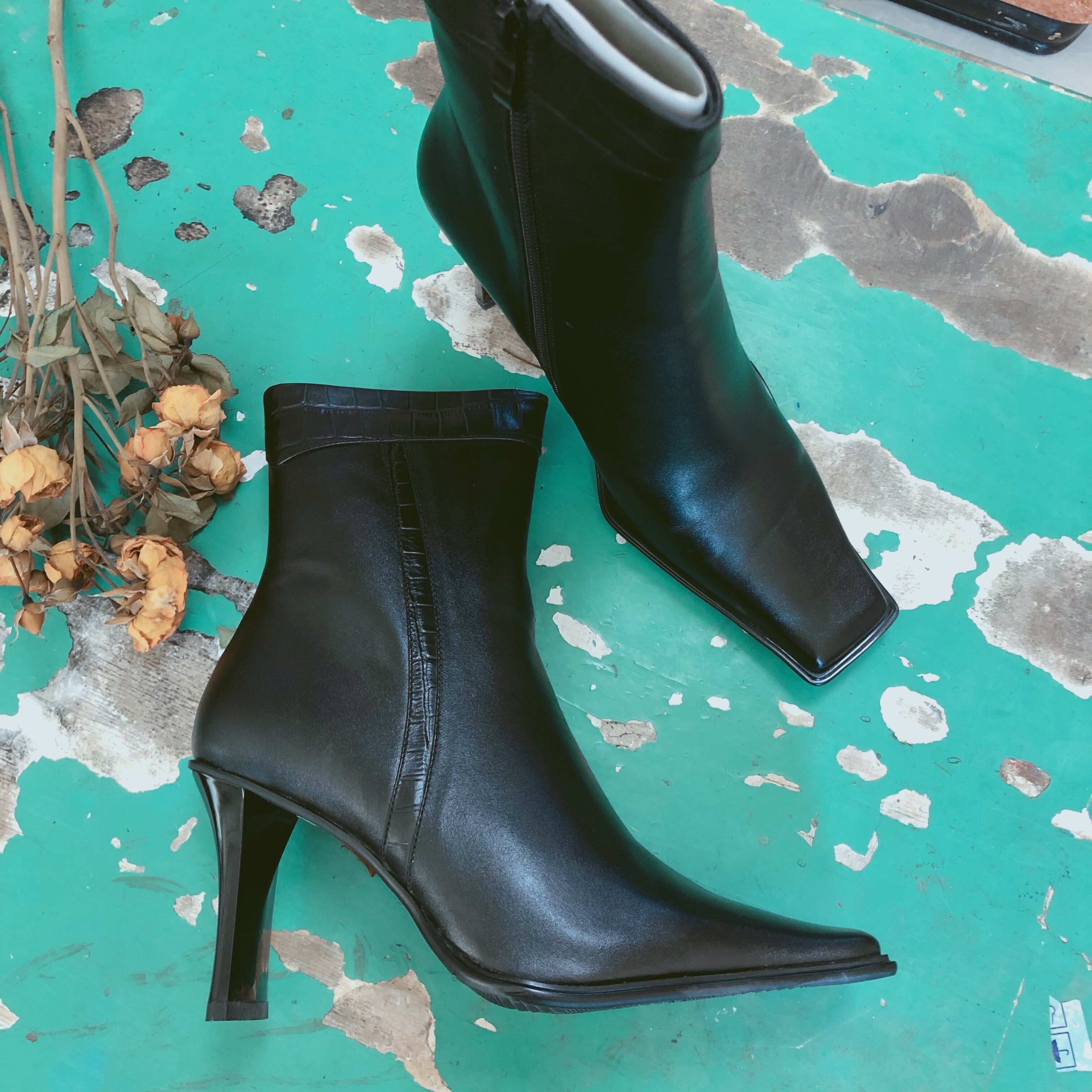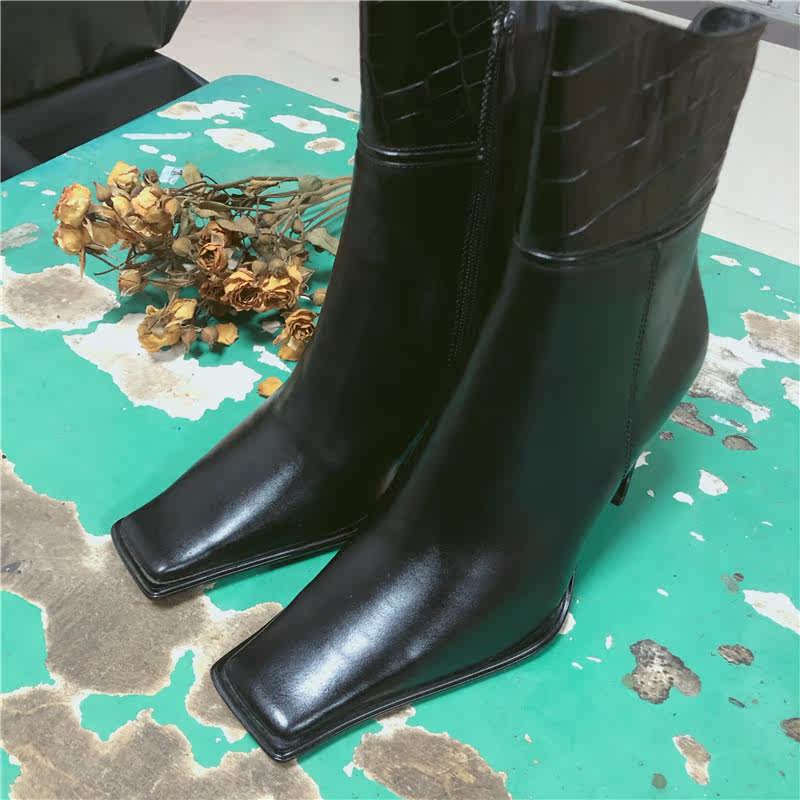vintage霹雳原宿港风个性大方头黑色百搭高跟古着短靴摩根系列