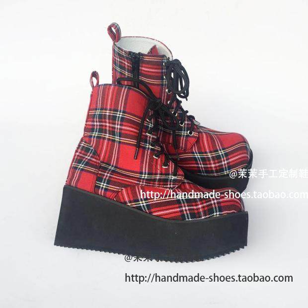 MOMO手工定制厚底大头鞋松糕跟系带短靴日本原宿系红格子复古