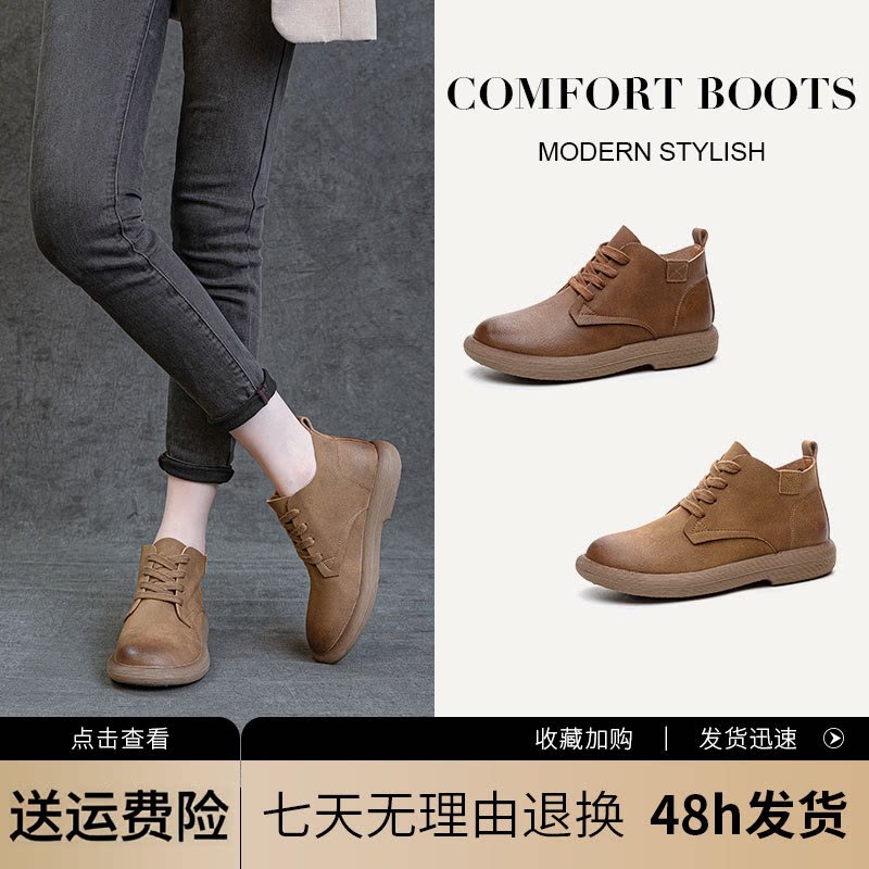 秋冬季外贸真皮复古原宿民族风女鞋头层牛皮手工高帮单鞋软底短靴