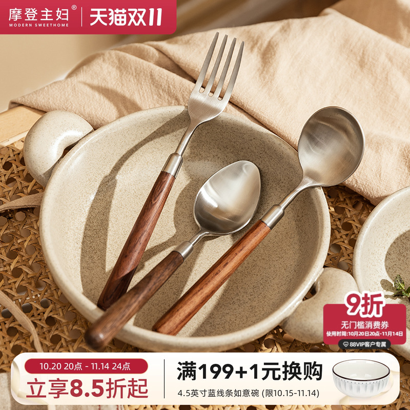 摩登主妇木柄勺子304不锈钢家用高档精致吃饭汤匙长柄叉子喝汤勺