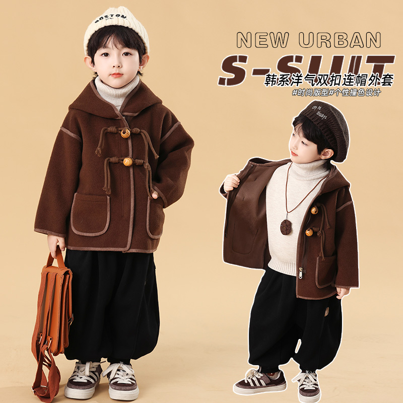 男童秋冬外套2025新款炸街连帽毛呢衣服加厚中大儿童男孩呢子大衣