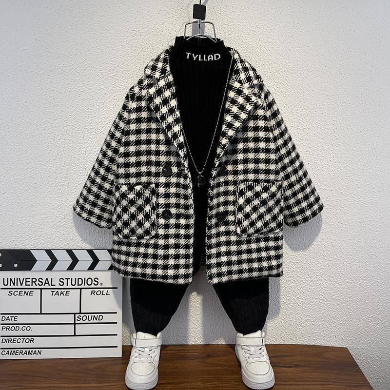男童呢子外套2023新款呢大衣加厚秋冬装中大童撞千鸟格夹克夹棉潮