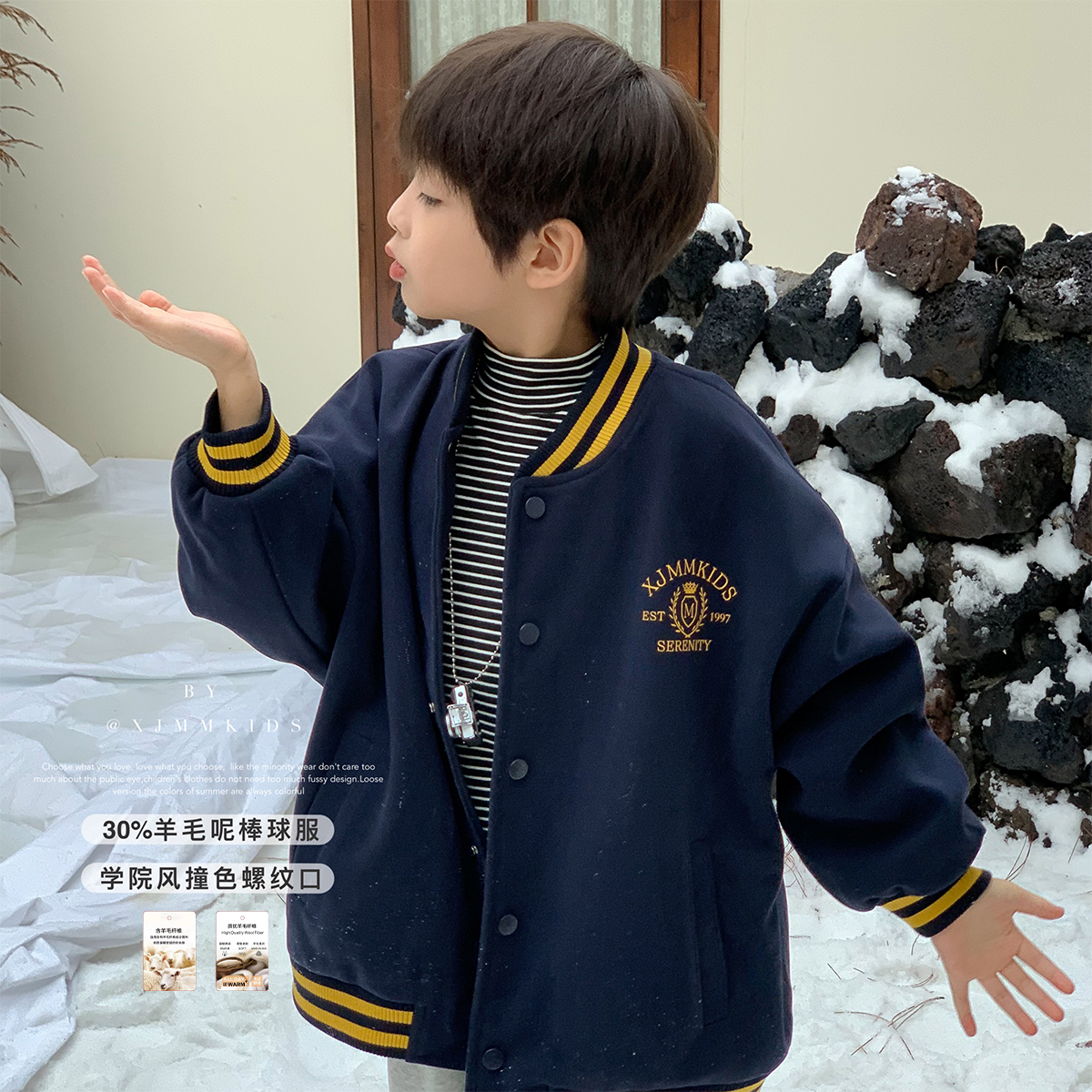 虾酱麻麻男童呢子外套冬装2025新款男孩学院风羊毛加厚儿童棒球服