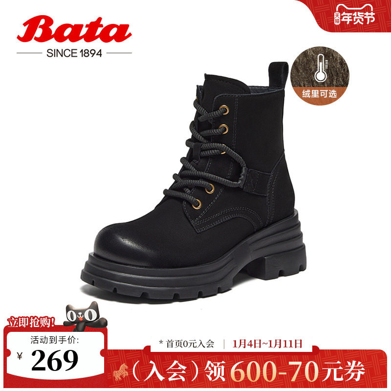 Bata英伦风复古马丁靴女冬季商场新款羊皮粗跟短筒靴2323DDD4