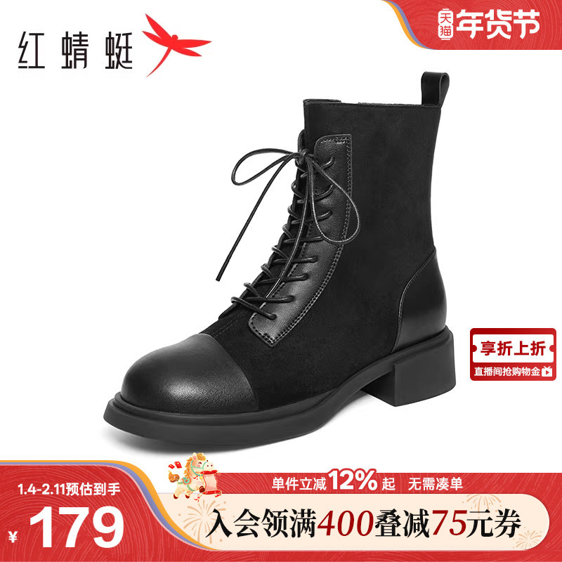 红蜻蜓马丁靴女冬季新款女靴英伦风短筒拼接短靴子复古弹力瘦瘦靴