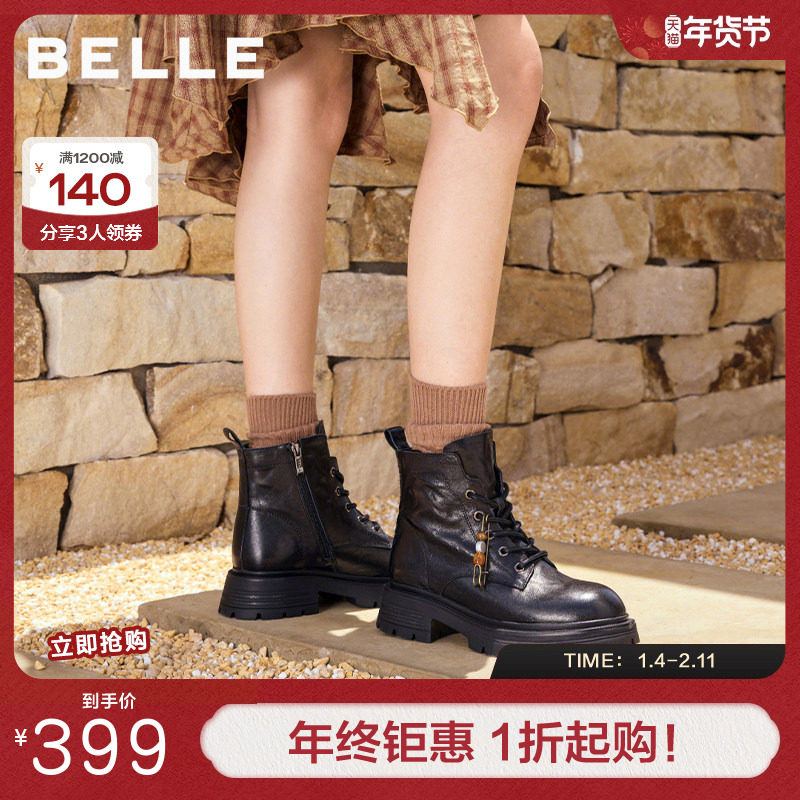 百丽厚底复古英伦风马丁靴女冬季新款工装靴加绒短靴子B9H1DDD4