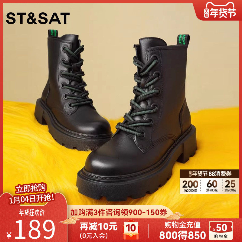 森达真皮马丁靴女冬款商场同款时尚英伦绒里厚底工装中筒靴XEC01