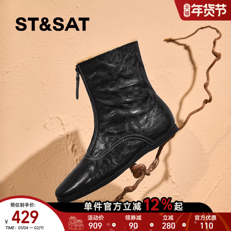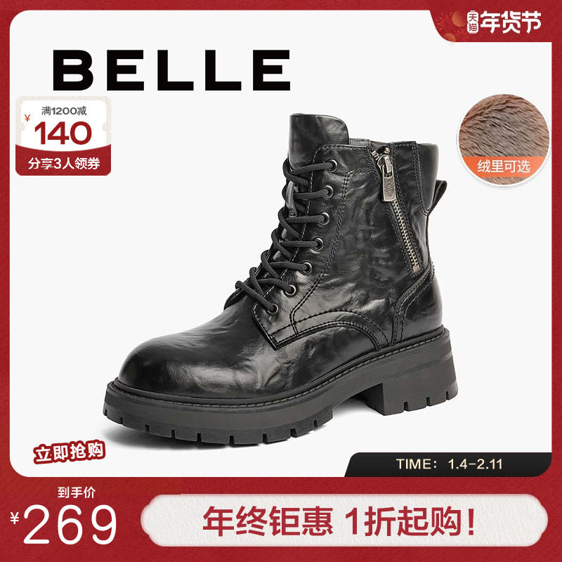 百丽靴子英伦风马丁靴女冬新款厚底皱皮复古加绒保暖短靴B9N1DDD4