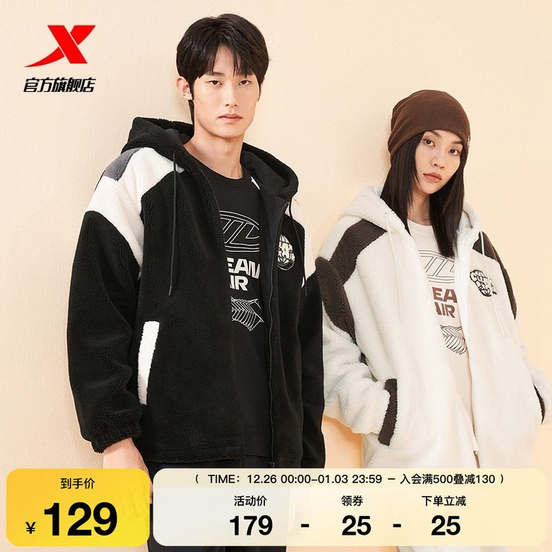 特步羊羔绒外套秋冬新款官方运动上衣保暖防风情侣款户外夹克风衣