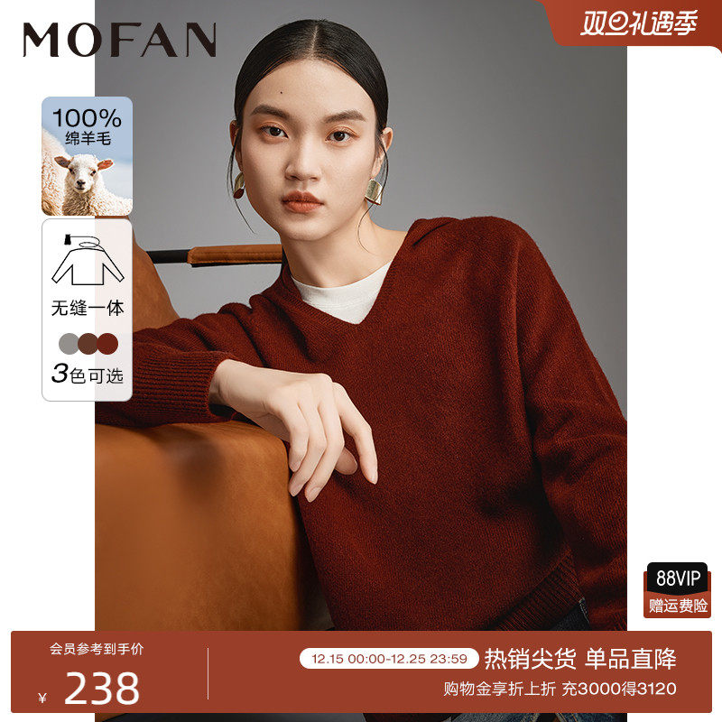 100%绵羊毛连帽针织衫女MOFAN摩凡2025秋冬无缝一织显瘦红毛衣