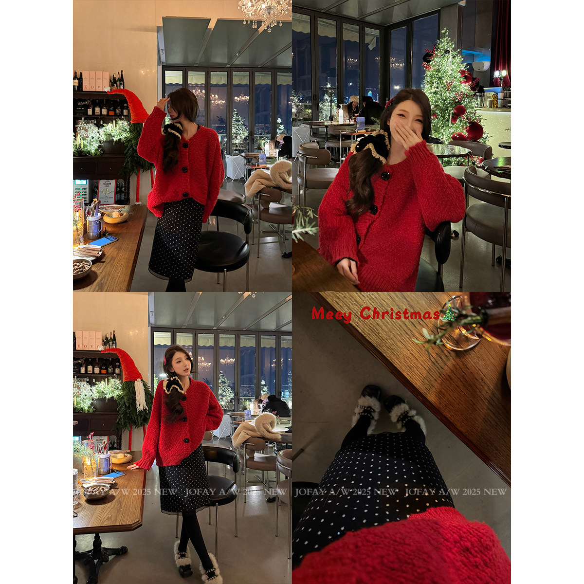小侨jofay 岁岁发财红毛衣 红色粗针毛衣外套 M1364