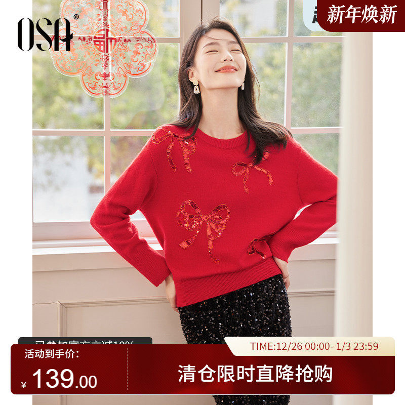 OSA欧莎安可拉红毛衣女2025年冬季新款蝴蝶结珠片绣花针织衫上衣