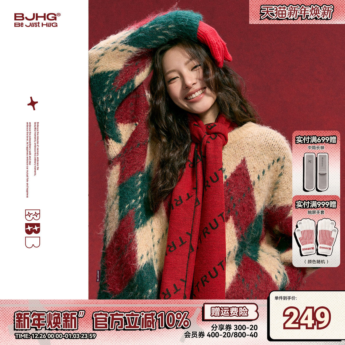 BJHG不计后果圣诞毛衣女款冬季潮牌红色复古格子宽松内搭针织衫男