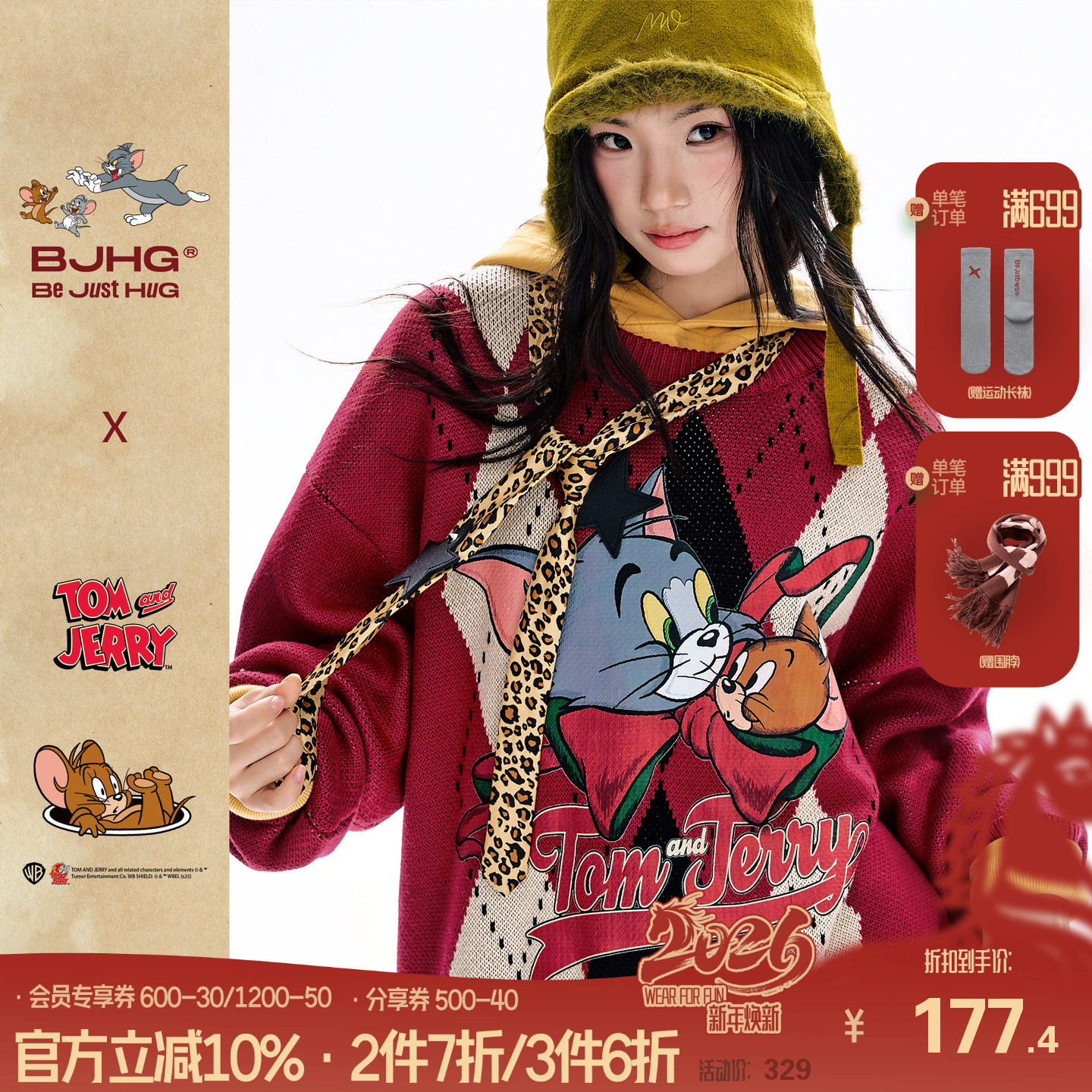 【猫和老鼠联名】BJHG不计后果菱格圣诞红毛衣男女冬季羊毛针织衫