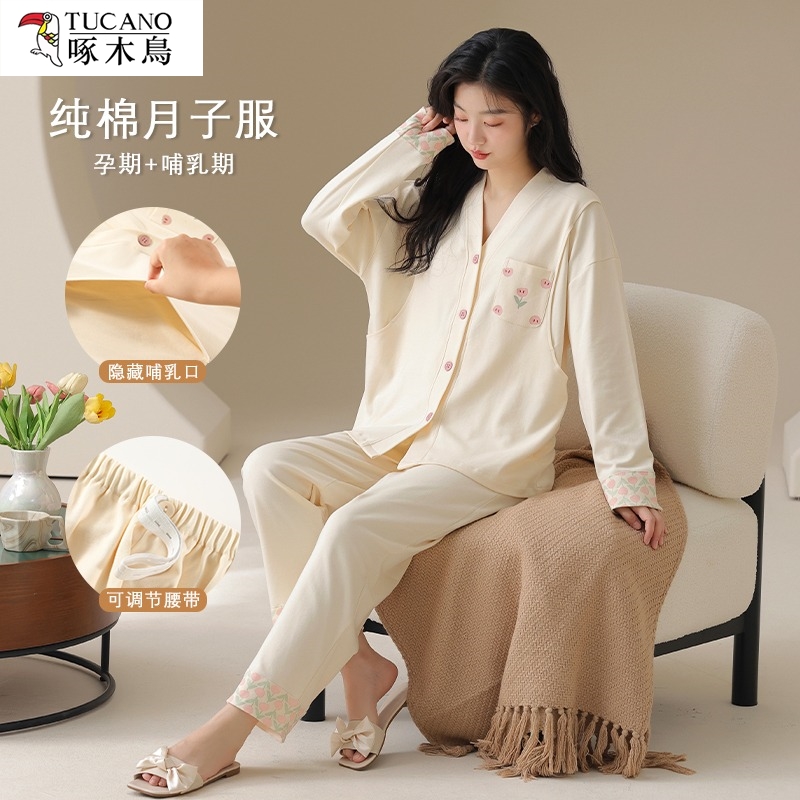 啄木鸟孕妇睡衣女春秋季月子服长袖开衫款简约孕后哺乳家居服套装
