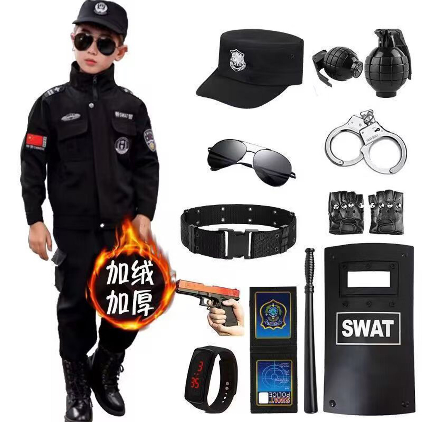 儿童警察加绒特警服特种兵套装军人装备衣服男童表演警官服装加厚