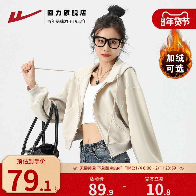 回力卫衣外套女秋冬款2025新款小个子短款开衫连帽加绒灰色外套女