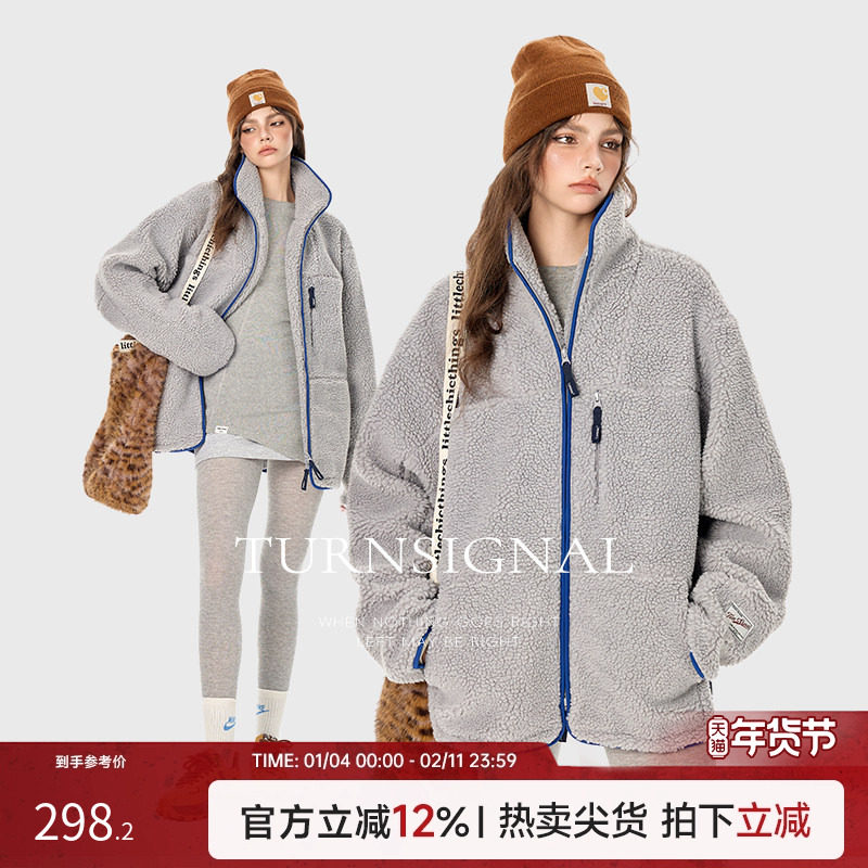TurnSignal时尚拼接仿羊羔毛外套女秋冬休闲宽松加厚保暖连帽外套