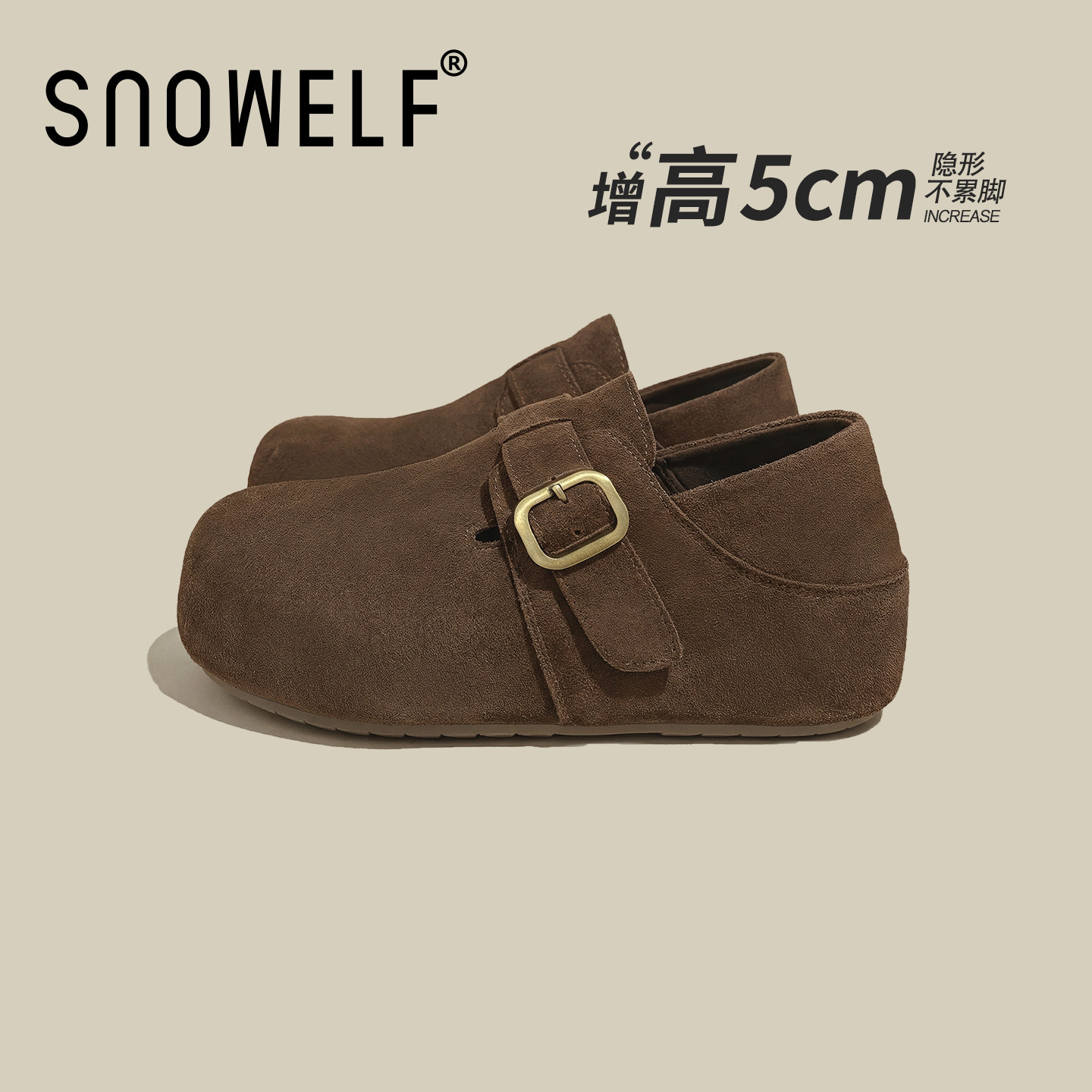 真皮版~内增高棕色乐福鞋女冬加绒单鞋布洛克雕花小皮鞋大码女鞋