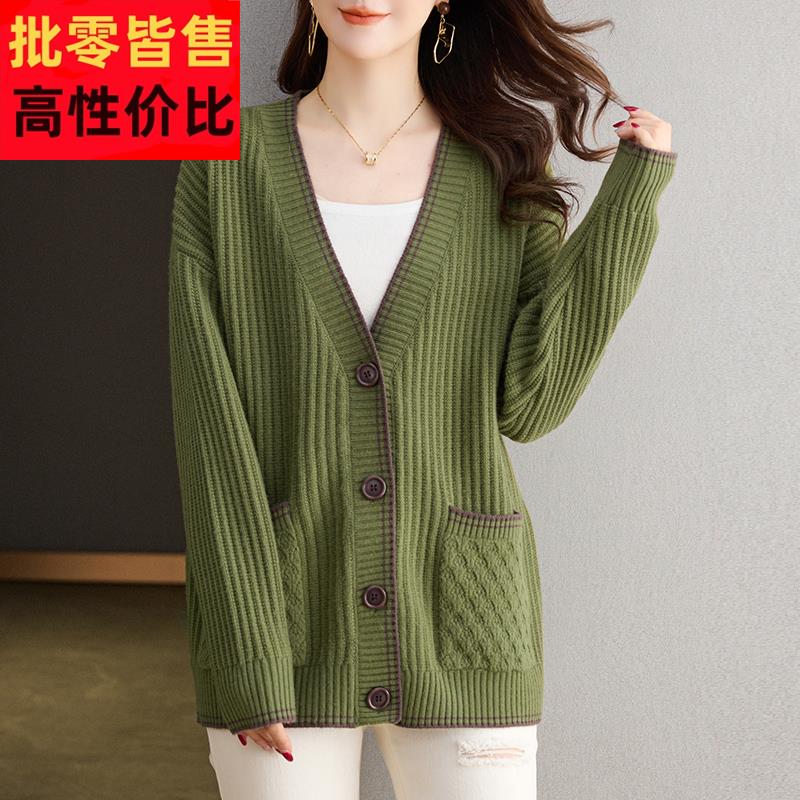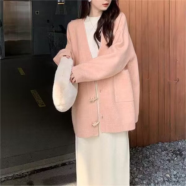 2023秋冬新款牛角扣针织开衫宽松胖妹妹毛衣外套女装纯色休闲