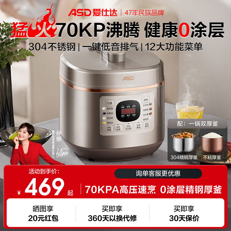 爱仕达家用电压力锅5L0涂层智能电高压锅304不锈钢适合1-6人用