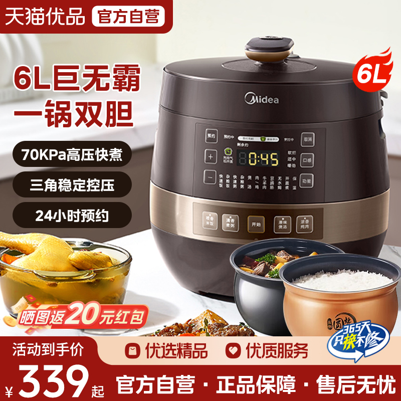 美的电压力锅家用6L升双胆智能高压饭煲2正品3-4-5-8人Simple101