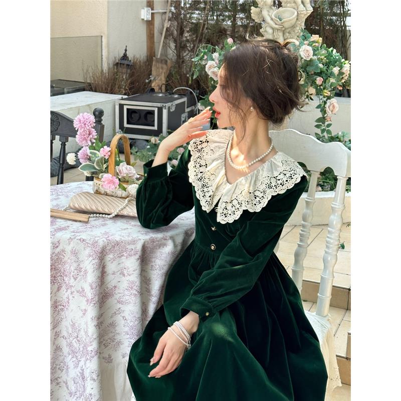 原版韩版重工花边方领露背丝绒连衣裙春装长袖气质收腰温柔长裙女