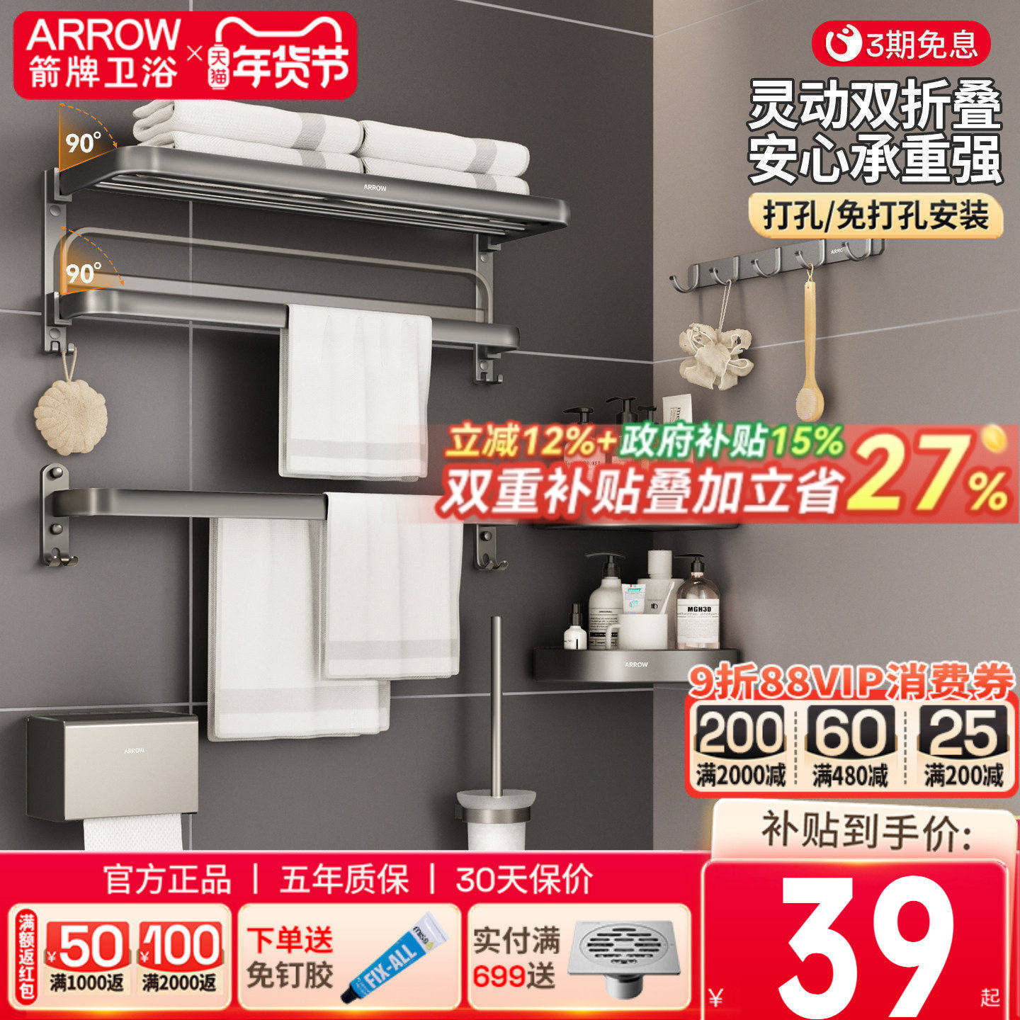 箭牌卫浴免打孔双折叠毛巾架子卫生间浴巾架挂件太空铝浴室置物架