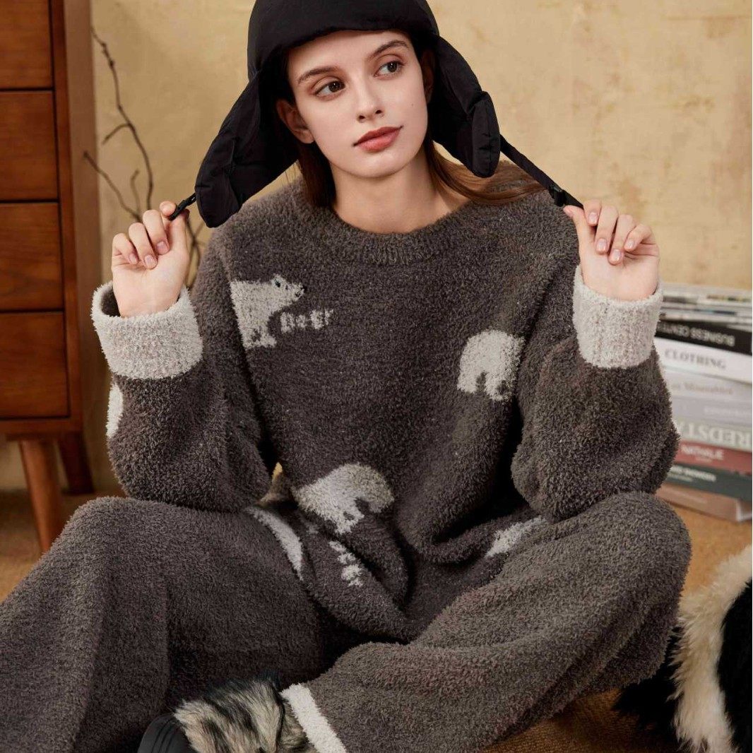 Yase【北极熊】韩式高级感半边绒秋冬季睡衣女加厚针织可外穿套装