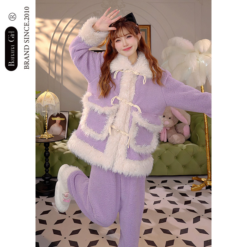 Bananagirl冬季睡衣女加厚翻领珊瑚绒女开衫甜美外套可外穿家居服